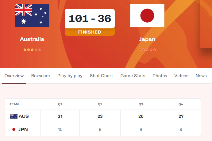 至于在第二场半决赛当中,澳大利亚队一边倒碾压日本队,他们首节开局就打出25-1攻势,且首节结束已经取得31-10领先21分巨大优势。日本队后三节提前缴械认输,他们之后连续三节单节得分个位数,澳大利亚队次节23-9净胜14分,第三节20-8净胜12分,第四节27-9净胜18分,最终澳大利亚队101-36狂胜日本队65分。