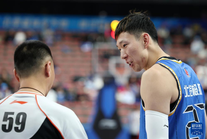1月13日,北京北汽队球员周琦(右)在比赛中与裁判交流。